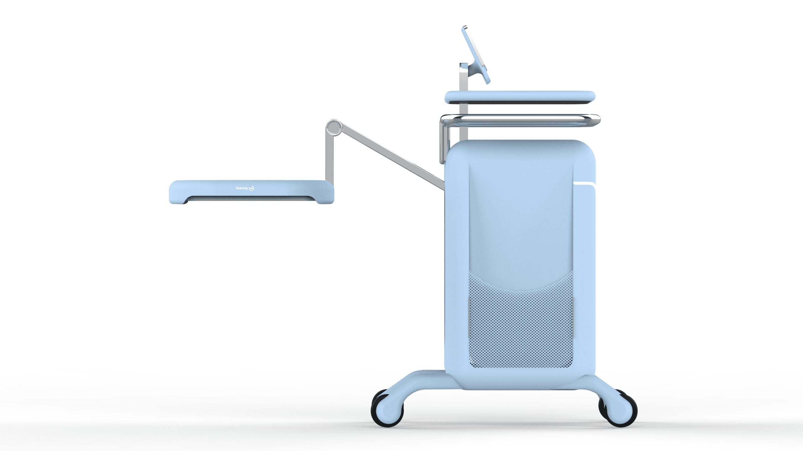 Designed for mobility, Andiela adapts to scenarios, storing accessories, hardware, and the shielding components within a compact structural base. The movable arm with shield panels allows the scanning components to fold, rotate, and position themselves around the patient with clarity and intention.